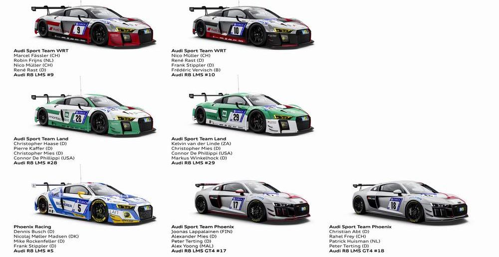 „24 godziny na Nürburgring, na najdłuższym na świecie torze wyścigowym, z ponad 160 uczestnikami zmagań, to z pewnością jedna z najważniejszych dla naszych klientów i dla nas imprez sportowych” – mówi Chris Reinke, szef Audi Sport customer racing. „Tak wielki entuzjazm klientów w stosunku do naszych samochodów, wskazuje nam kierunek dalszego rozwoju.” Tylko w topowej klasie SP9-GT3, na starcie staną 34 samochody reprezentujące siedem różnych marek. Czołówkę stawki uformowały zespoły jeżdżące najnowszymi Audi: Audi Sport Team Land i Audi Sport Team WRT. Za sterami Audi zasiądzie sześciu zwycięzców poprzednich edycji wyścigu oraz sześciu innych, najwyższej klasy kierowców. Auta spod znaku czterech pierścieni w klasie GT3 wystawią też zespół Car Collection Motorsport oraz team Phoenix Racing, dzierżący od roku 2014 rekord dystansu pokonanego na Nürburgring Nordschleife. Cel dla Audi: zdobycie kolejnego zwycięstwa w „zielonym piekle” Nürburgring i uzupełnienie w ten sposób kolekcji wygranych z lat 2012, 2014 i 2015.