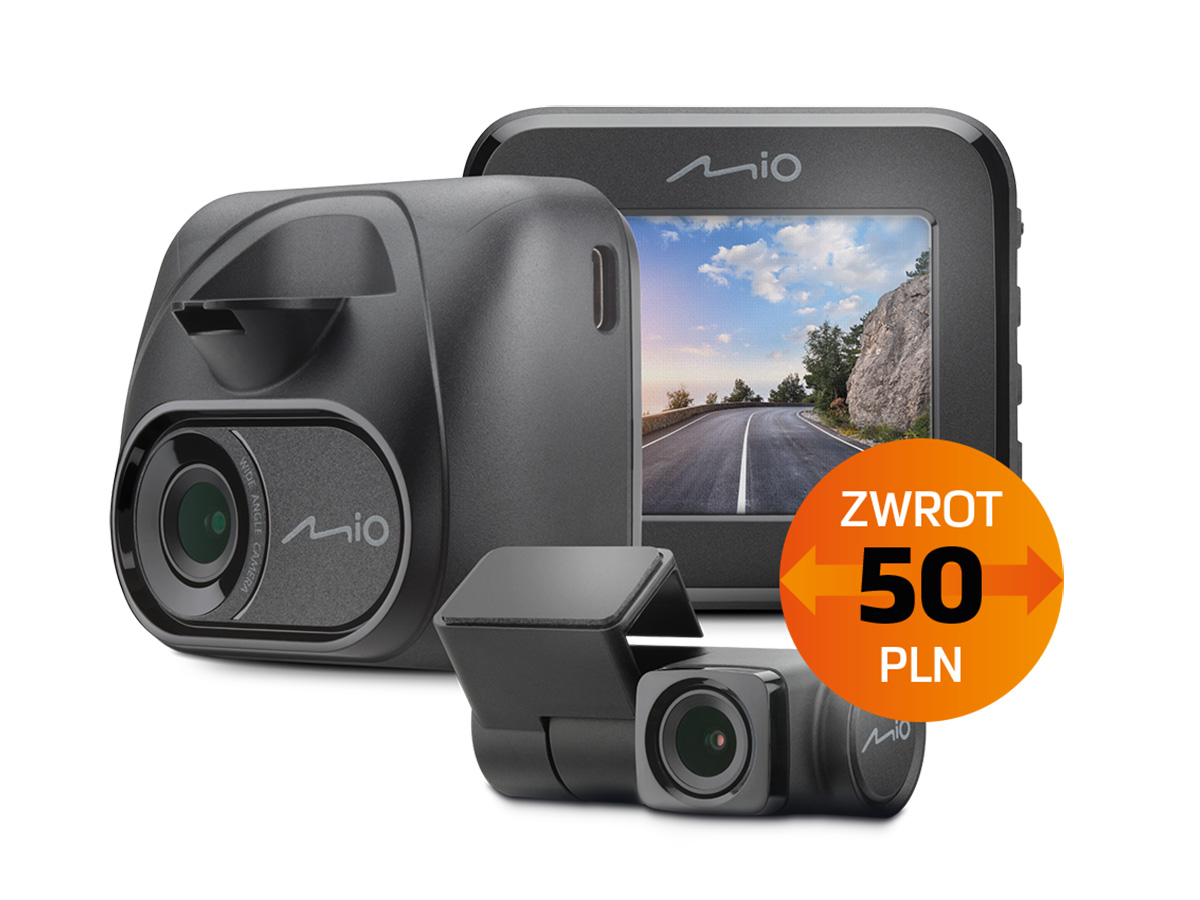 Zestaw zawiera tylną kamerę Mio MiVue T35, która nagrywa trasę z tyłu pojazdu, a dzięki 8-metrowemu kablowi nadaje się również do większych aut. Zestaw Mio MiVue C595W Dual kosztuje 549 zł. Dzięki akcji Cashback można uzyskać dodatkowe 50 zł zwrotu.