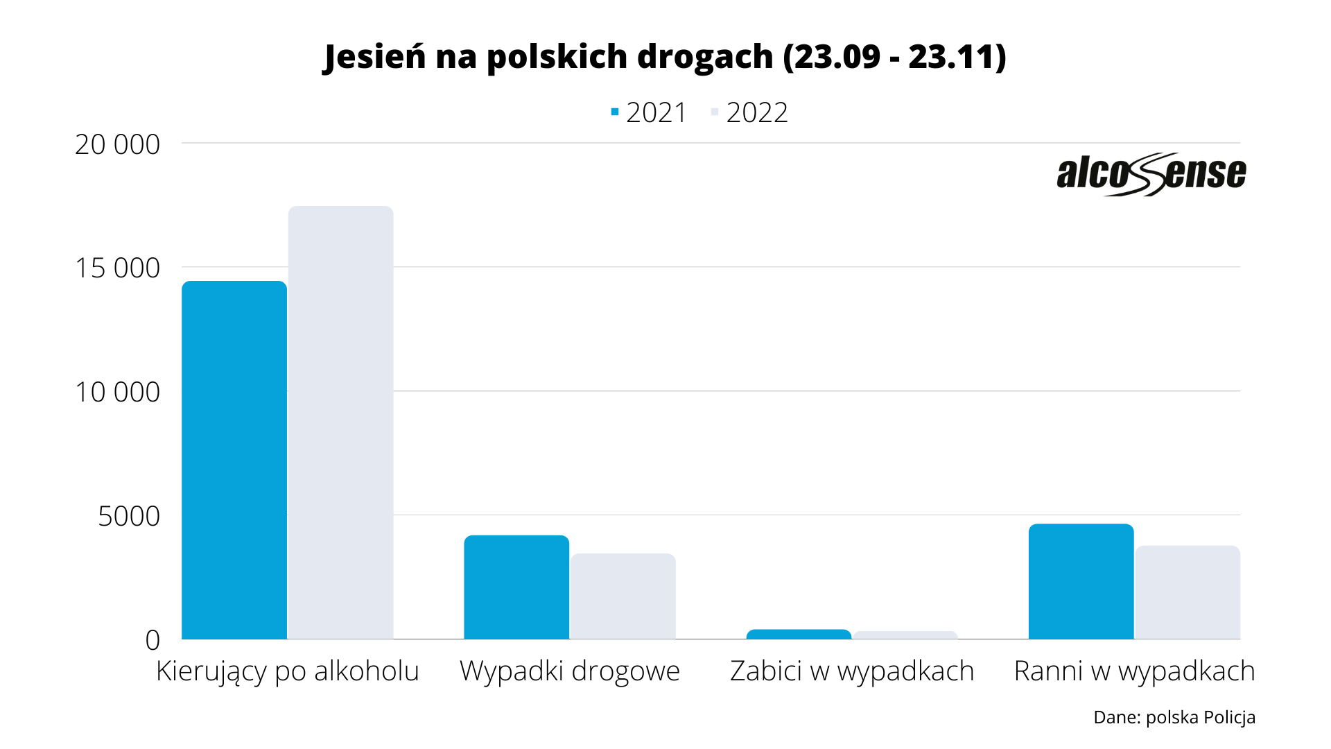 W dwóch pierwszych miesiącach jesieni (między 23 września a 23 listopada) służby zarejestrowały 3438 wypadków, w których zginęło 313 osób, a 3753 zostały ranne. Każda z tych statystyk spadła o 18% względem analogicznego okresu zeszłego roku. Wyjątkiem jest liczba pijanych kierowców. Tych było na drogach o ponad 3 tys. więcej niż jesienią 2021 roku.