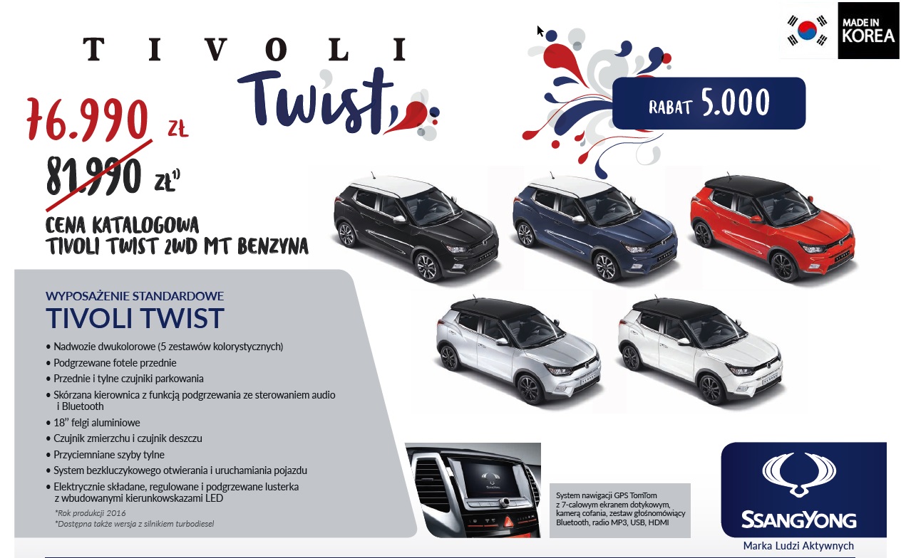 SsangYong przygotował ciekawą ofertę na swój model Tivoli. Samochód dostępny jest w dwukolorowej wersji Twist na wyprzedaży rocznika 2016. Przygotowanych zostało 5 zestawów kolorystycznych.