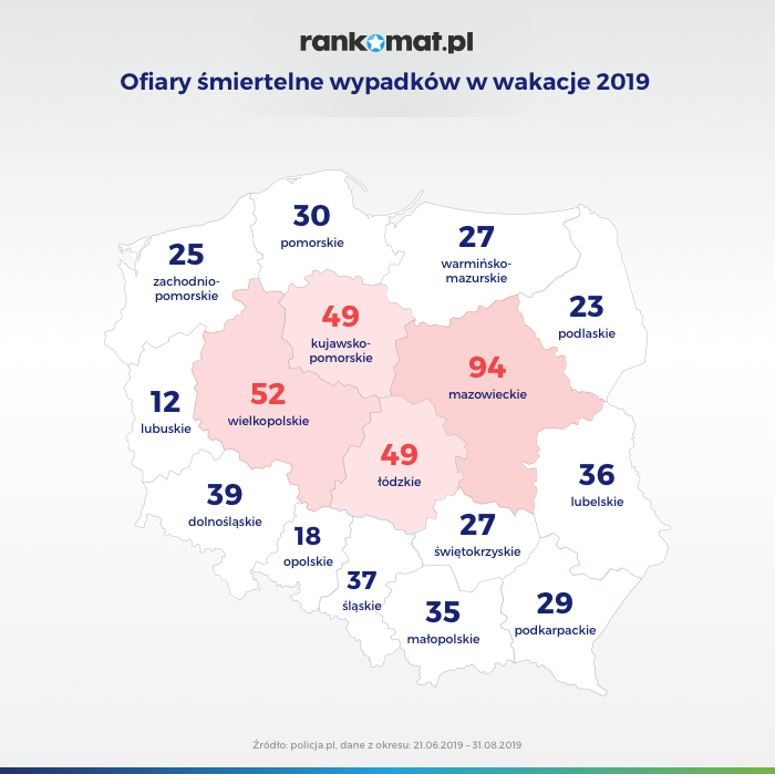 W czasie tegorocznych wakacji policja odnotowała 582 wypadki śmiertelne. Najbardziej niebezpiecznym województwem okazało się być mazowieckie (94 wypadki). Najmniej takich zdarzeń odnotowano natomiast w woj. lubuskim (12).